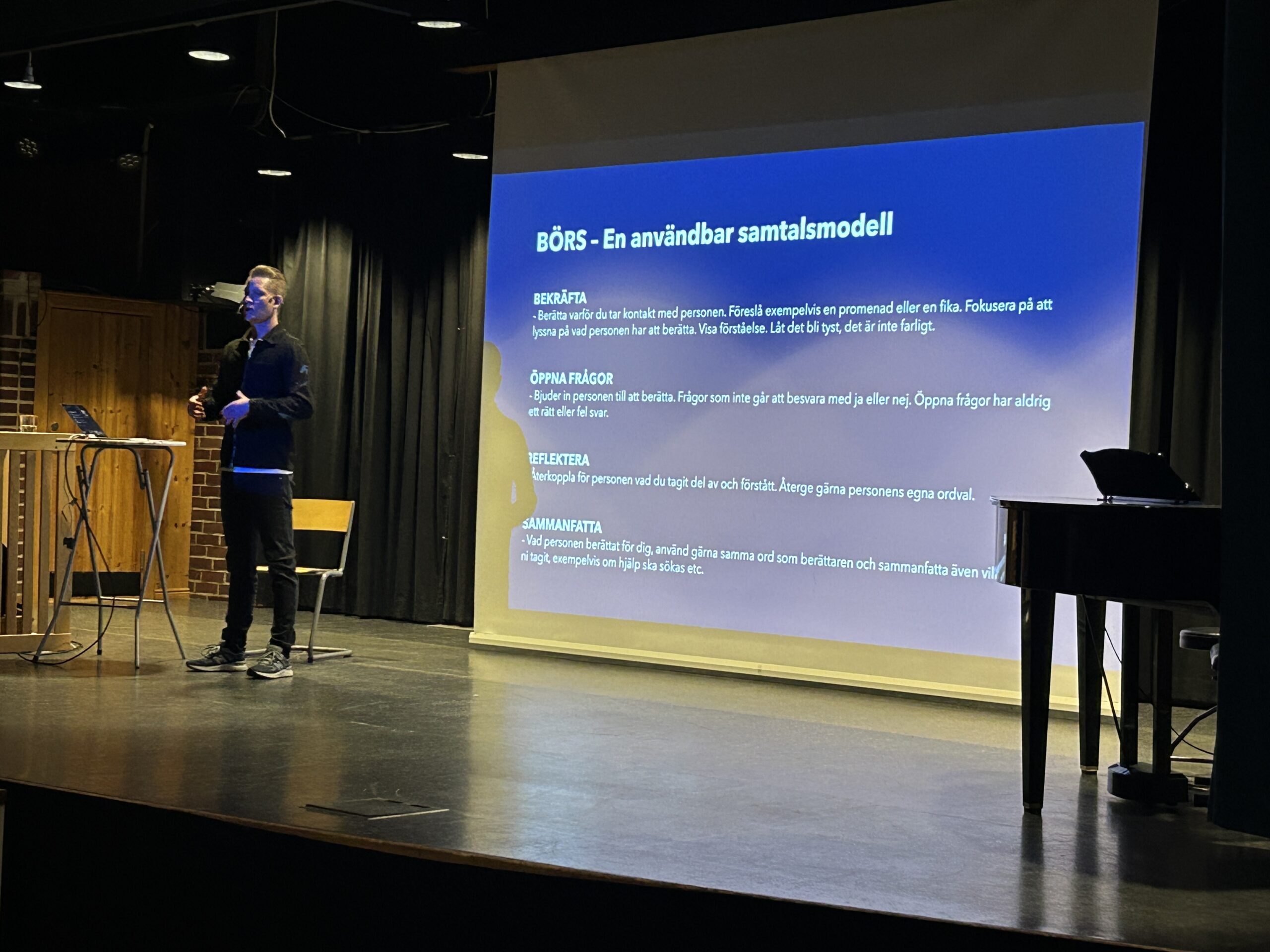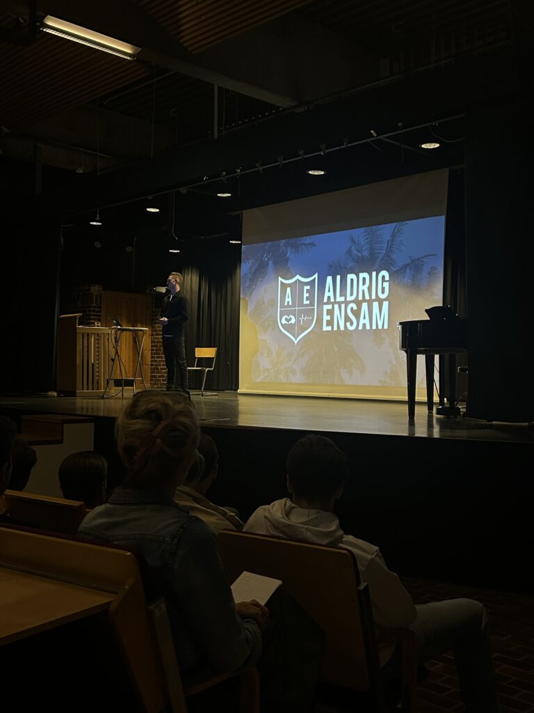 Från mörker till ljus. I förra veckan föreläste Charlie Eriksson för våra treor om sin väg från flera självmordsförsök tillbaka till livet och glädjen. Charlie Eriksson är grundare av den ideella föreningen Aldrig ensam. Föreningens syfte är att bryta tystnaden och våga prata om psykisk ohälsa. För just ensam kände sig Charlie Eriksson. I samhällets bild av hur män och killar ska vara ingår inte att man ska må dåligt, tycker Charlie, som länge försökte hålla upp en fasad mot omgivningen.