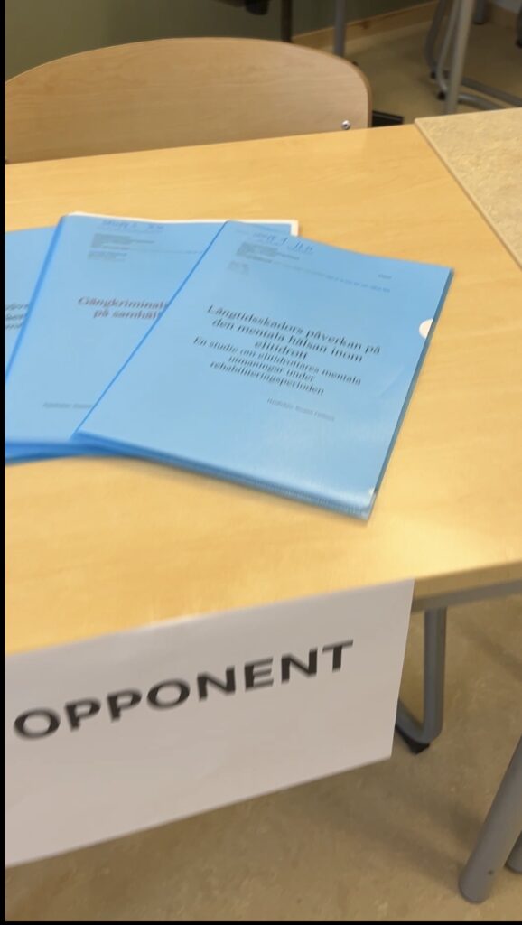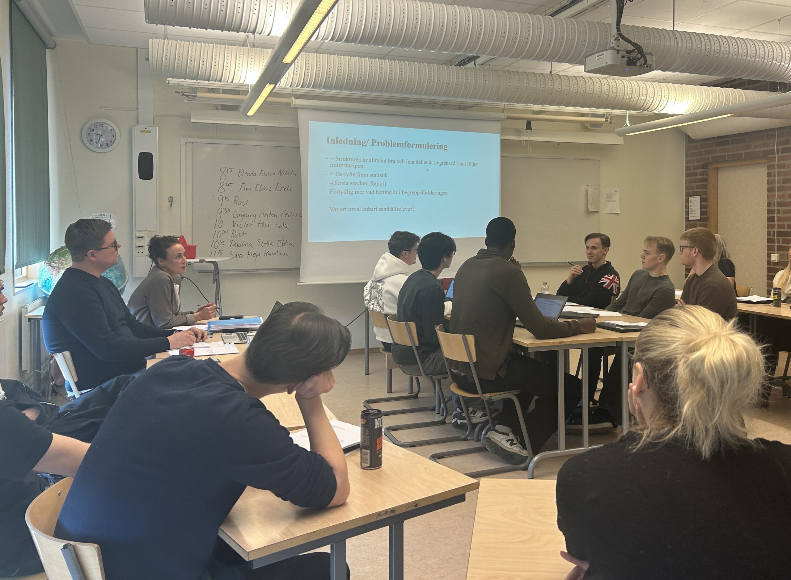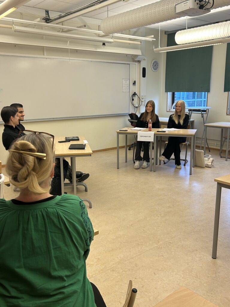 Så klart är det lite pirrigt både för dem som ska försvara sitt arbete och för dem som ska ställa frågorna. Men i klassrummet med SA23B känns den ömsesidiga respekten när Loke, Hai och Victor ska opponera på Cedrics, Grynings och Antons gymnasiearbete om Spelmissbruk hos unga.